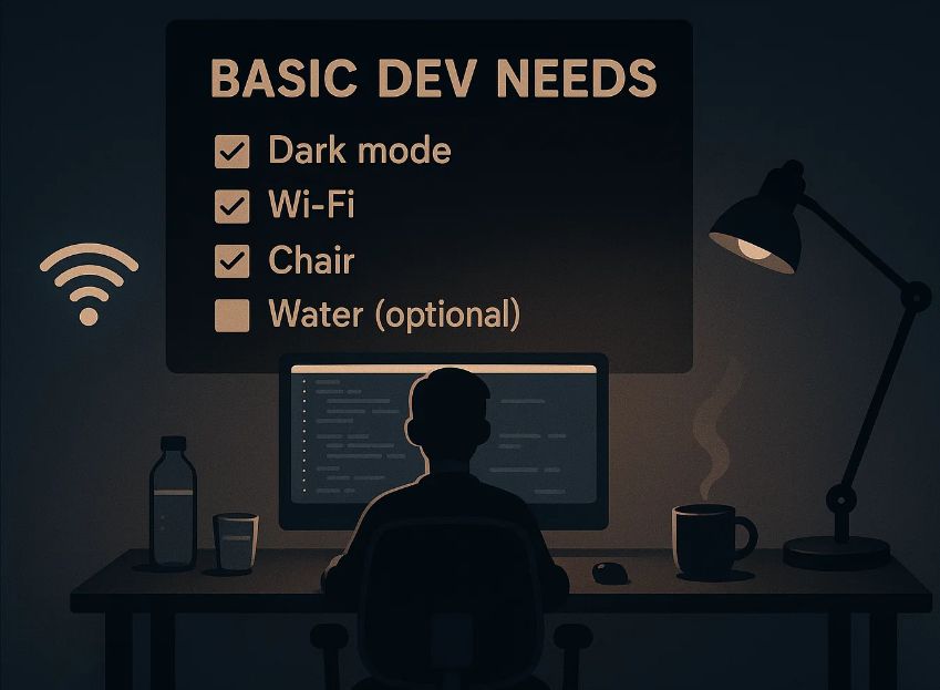 Basic Dev Needs: ->Dark mode ✅ ->Wi-Fi ✅ ->chair ✅ ->Water (Optional) ->coffee ✅