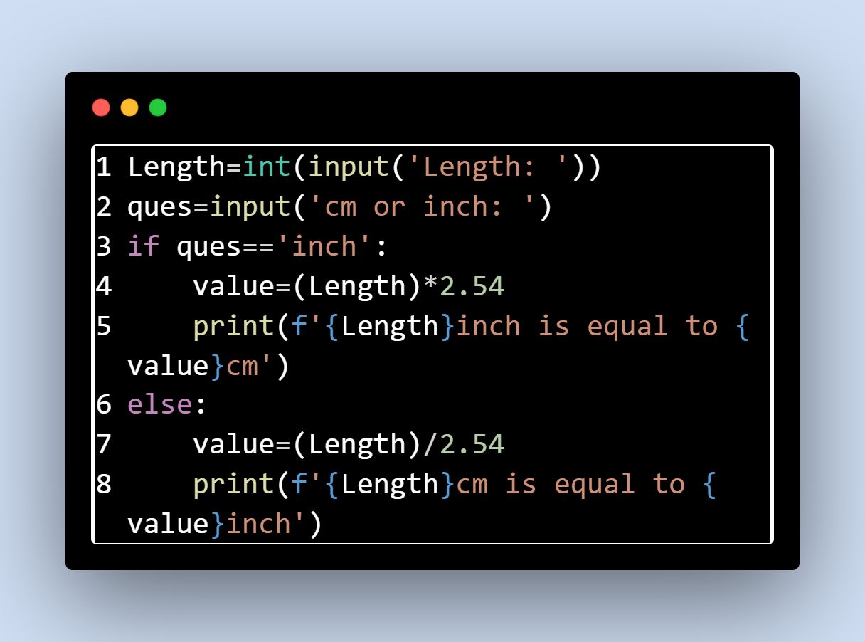 This is a simple python program which is used to convert one unit into another unit. In the program below you can see it converted centimeter into inch. You can change the values and convert different types of units into another units.
