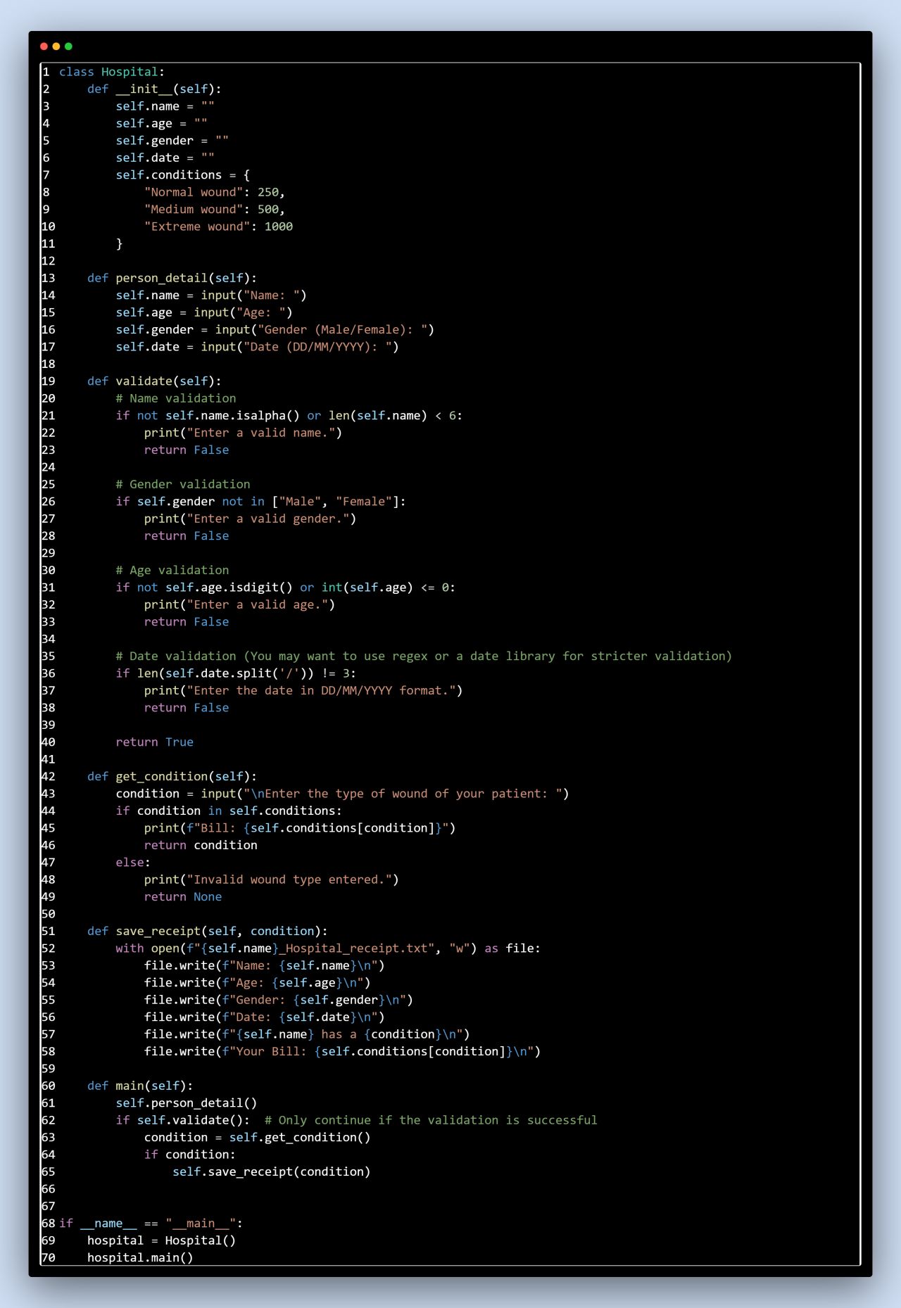 Today, I made a Hospital Management system in python using class methods and open function in python. It takes user input and store it into a file.